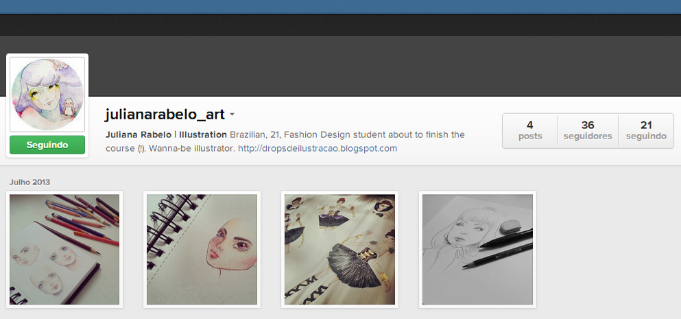 Ele ainda tem poucas fotos e poucos seguidores, mas é nesse perfil que vocês vão encontrar minhas ilustrações, agora (: E ele também aparece aqui, no menu lateral do blog! Espero que gostem!